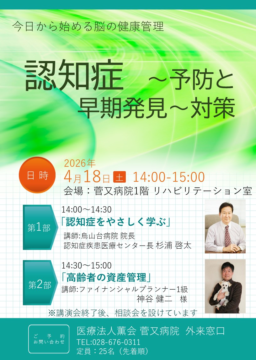 令和8年4月18日(土)に菅又病院 1階リハビリテーション室にて「認知症 ~予防と早期発見~対策」と題しましてセミナーを開催いたします。